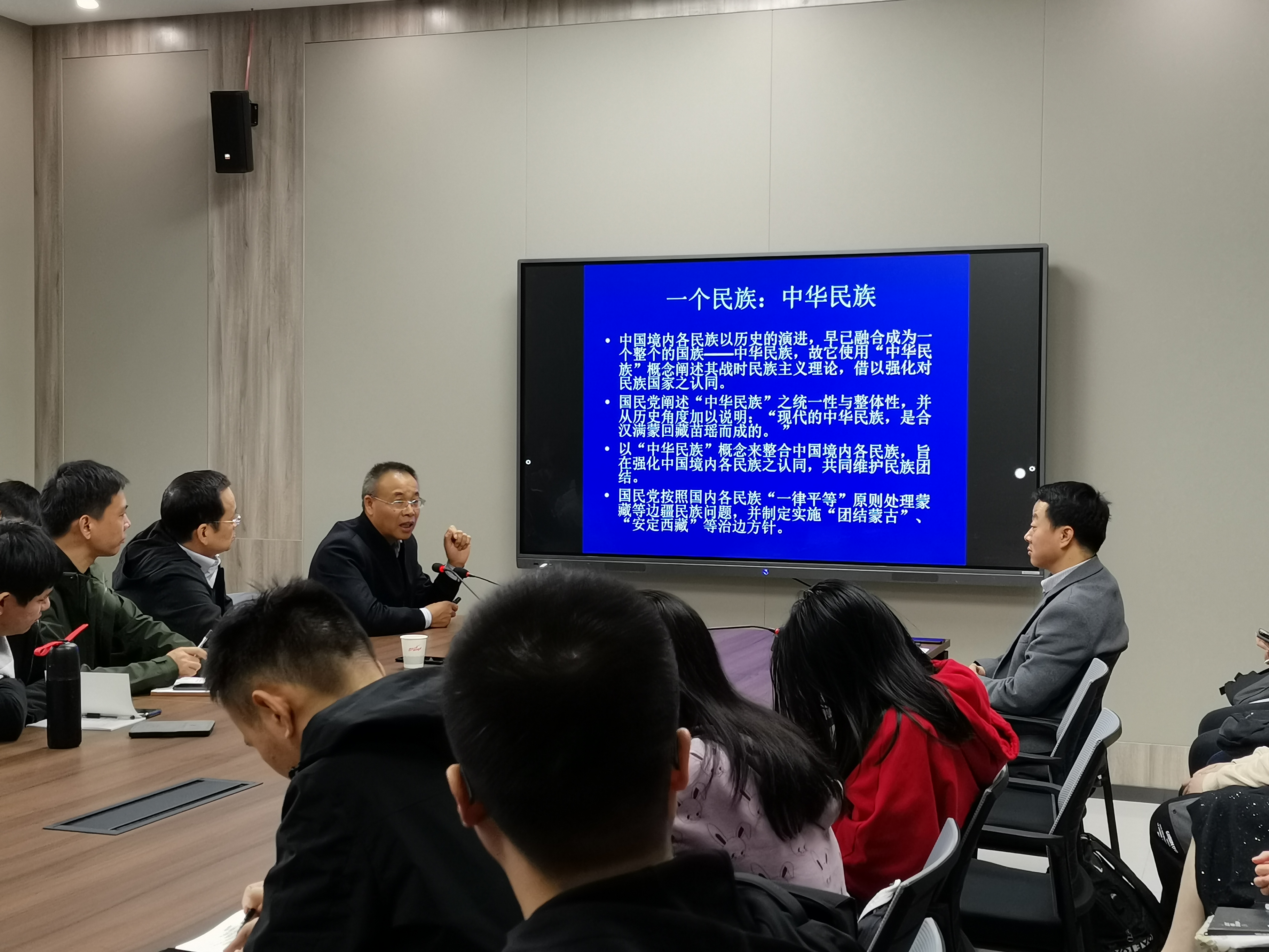 随后,左老师集中详细探讨了国民党的战时政治思想。国民党政府经历了从避战、应战到抗战的变化。围绕抗战还是“和平”,国民党内存在严重的分歧,但最后在多种因素作用下国民党主战派由应战走向了抗战。之后围绕如何抗日,国民党制定了抗战建国纲领,对三民主义进行了新阐释,突出民族主义的时代主题,但对民权主义及民生问题相对漠视。国民党对民族主义的新阐释集中于两方面,即对外强调抗战目的在于求民族生存独立,对内强调中华民族统一性,主张国内各民族一律平等。国民党战时民族主义具有两个特点:一是守旧的中国传统,以“忠孝仁爱信义和平”之八德与“礼义廉耻”之四维建构战时伦理的核心内容;二是开放的国际视野,始终强调中国抗战是世界反法西斯战争的重要组成部分。左老师还解读了国民党围绕如何取胜形成的“积小胜为大胜,以空间换时间”的持久消耗的军事战略。最后围绕如何建国,左老师详细对比了国民党、中国共产党以及民盟等对中国未来之命运的设想,各派均赞同“抗战与建国”并行,但在具体蓝图的设想规划上存在差异。指出国民党在战时虽采取了一定的民主措施,如通过《抗战建国纲领》和举行国民参政会。但同时建立了高度集权的政治体制,将军事决策指挥权、党权、政权集中于蒋一人,实行集中化、军事化的管理制度。这种政治体制一定程度上是迫于战争的客观形势,但却将民族国家的自由置于个人自由之上,甚至以此为借口抹杀个人自由,回避、漠视民权主义及民生主义,将三民主义变成纯粹的民族主义,难以满足社会各界保障民权自由的要求。抗战时期,国民党虽在正面战场做出了巨大的牺牲和贡献,但不能满足全国人民对新中国的期望,指出中国共产党新民主义新中国的伟大进步性和胜利的必然性。